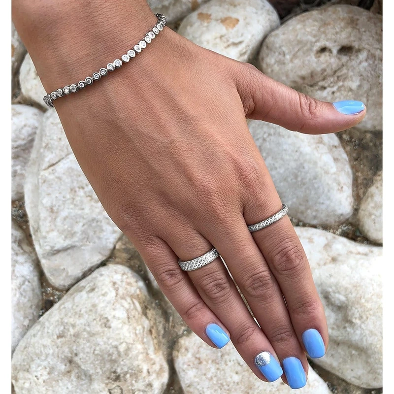 • טבעת חישוק מעוטרת מזהב לבן 14K בשיבוץ זירקונים.