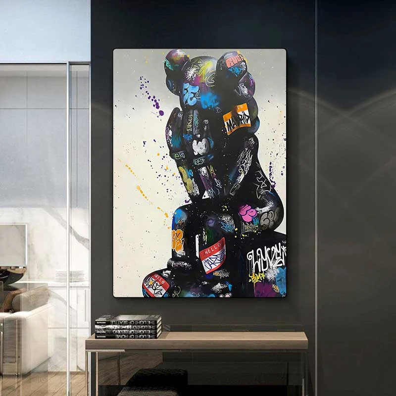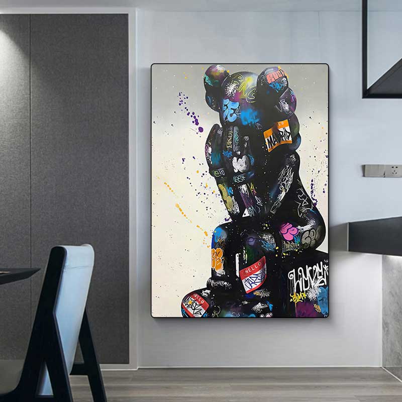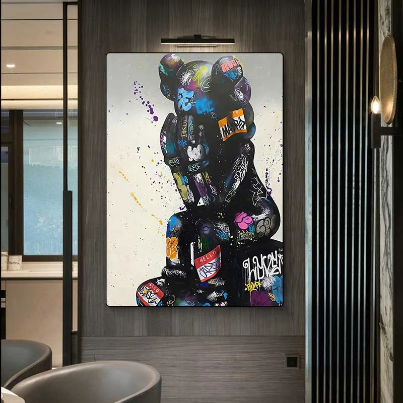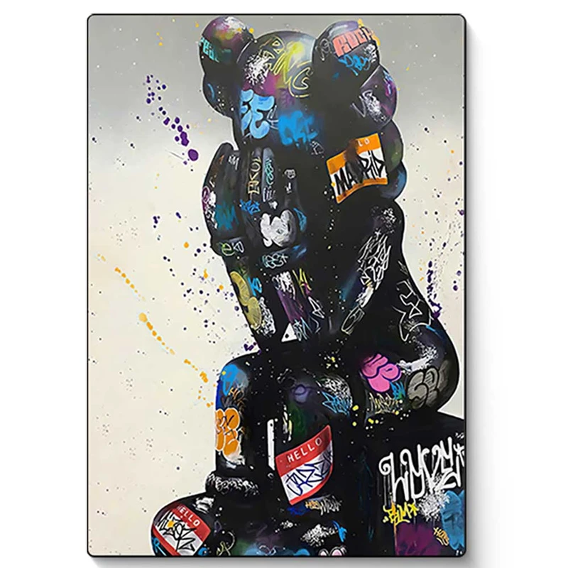 • תיאור: בובה שחורה יושבת, עם הדפסי גראפיטי צבעוניים.