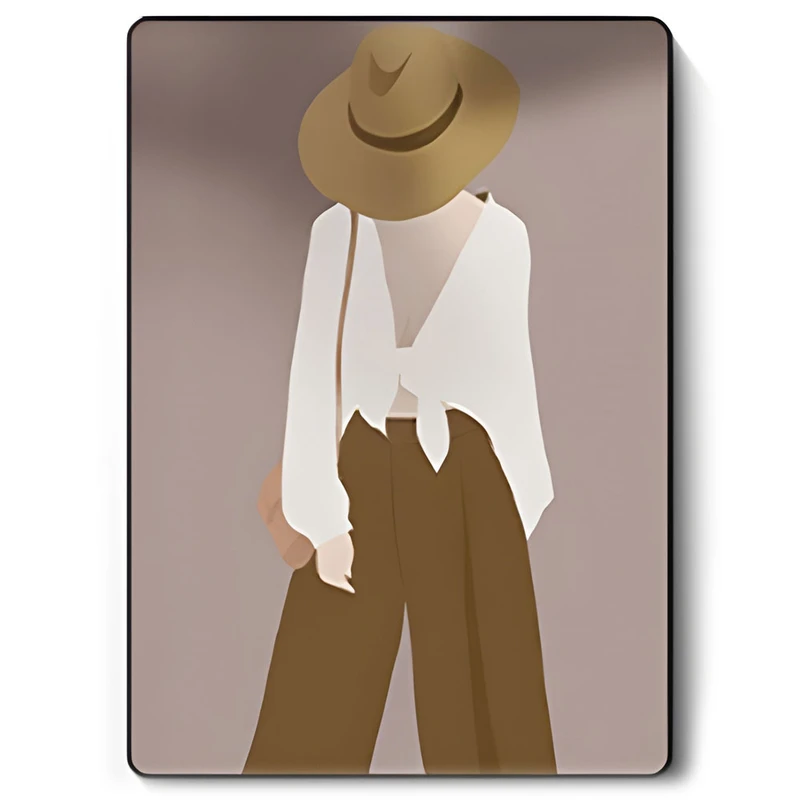 • תיאור: דמות אישה עם כובע ברקע חום בהיר.