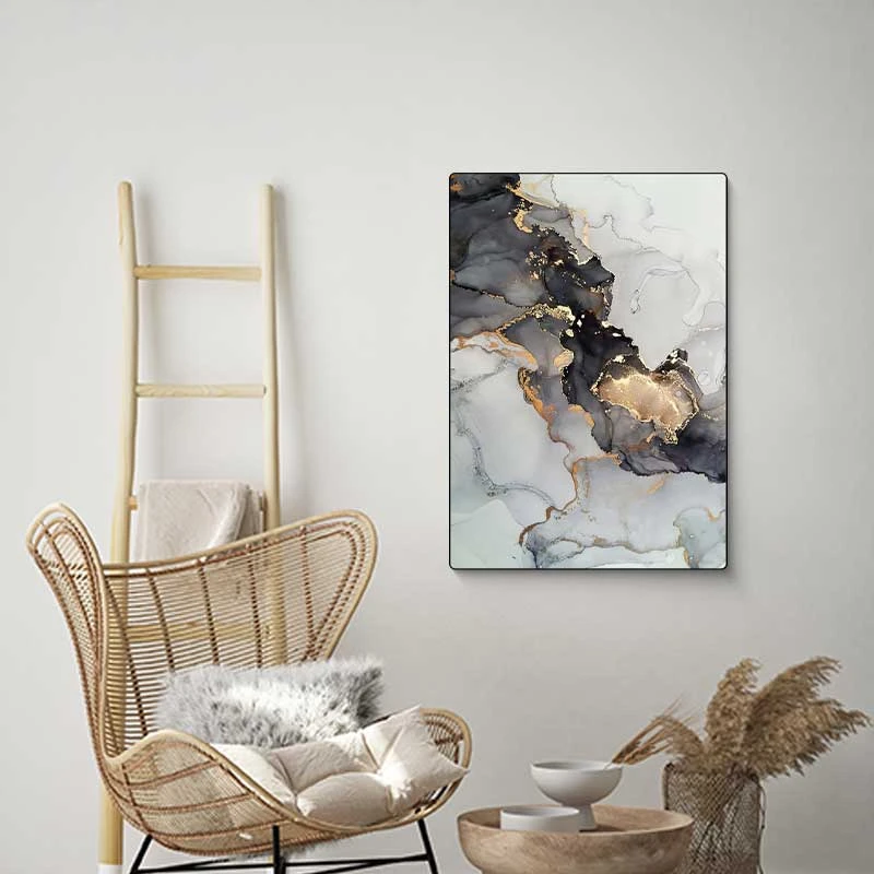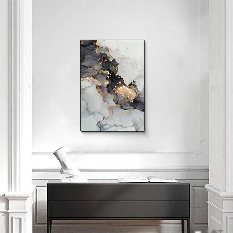 • תיאור: התזה של צבעים שחור, אפור כהה וזהב על רקע אפור.
